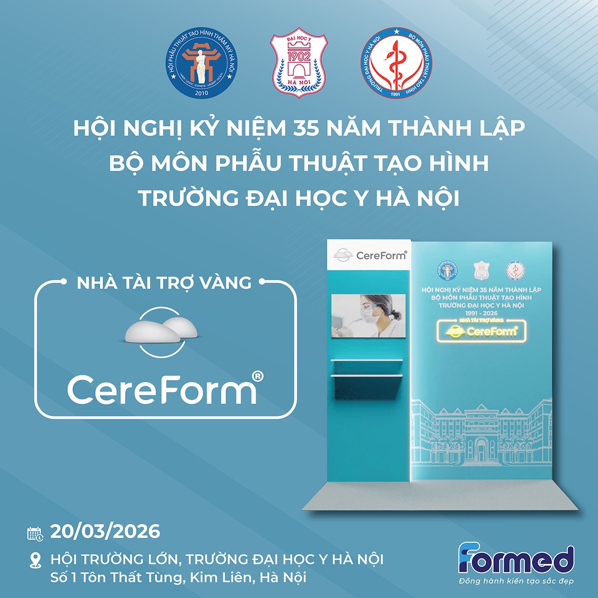 CereForm Việt Nam vinh dự đồng hành cùng sự kiện với vai trò Nhà tài trợ Vàng. Chương trình được tổ chức với sự phối hợp của Hội Phẫu thuật Tạo hình Thẩm mỹ Hà Nội, quy tụ đông đảo chuyên gia, bác sĩ và nhà khoa học trong lĩnh vực phẫu thuật tạo hình – thẩm mỹ trong nước và quốc tế. Đây không chỉ là dịp nhìn lại chặng đường phát triển của Bộ môn mà còn là diễn đàn chuyên môn nhằm cập nhật các tiến bộ y khoa, chia sẻ kinh nghiệm lâm sàng và thúc đẩy kết nối học thuật trong ngành.