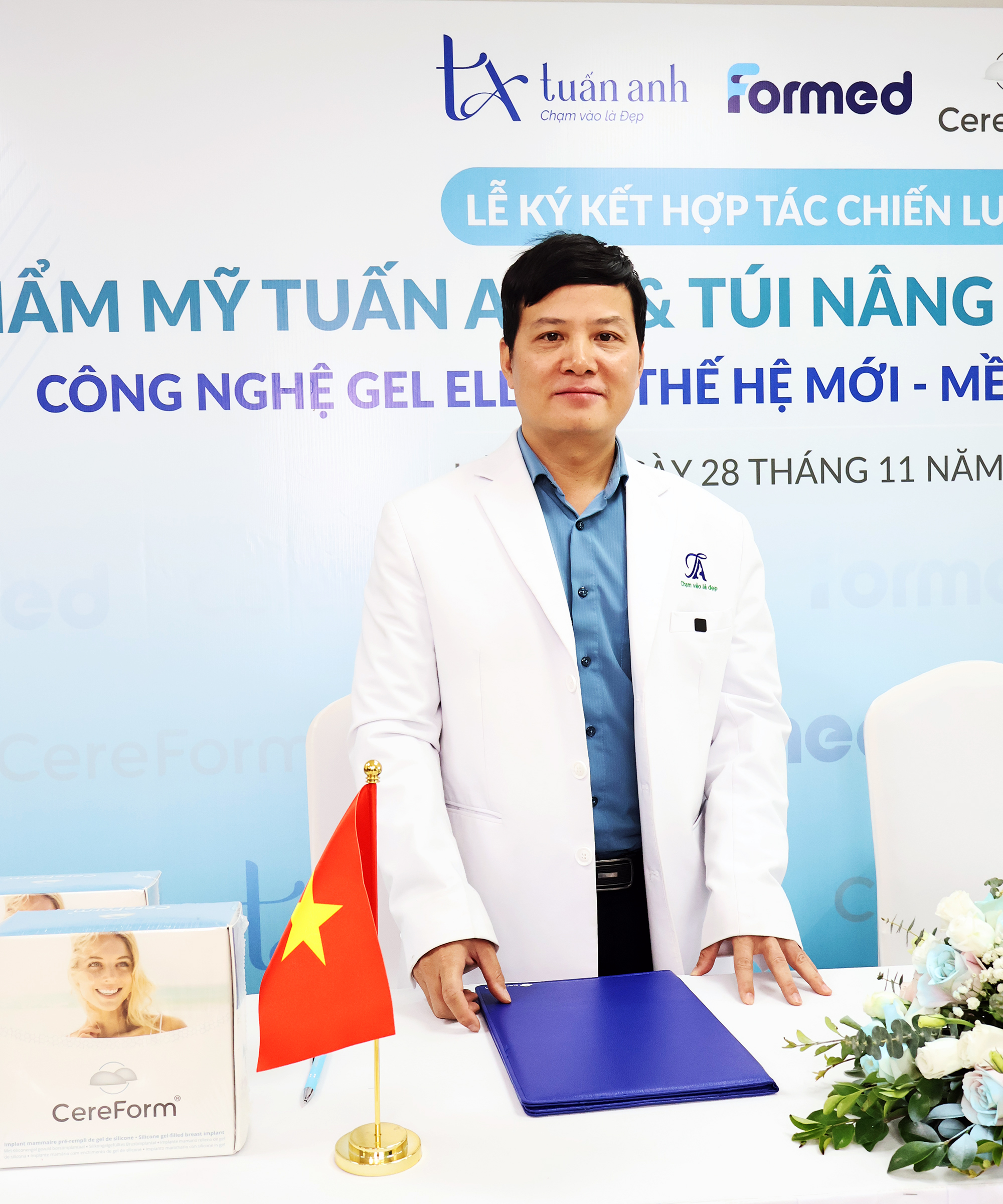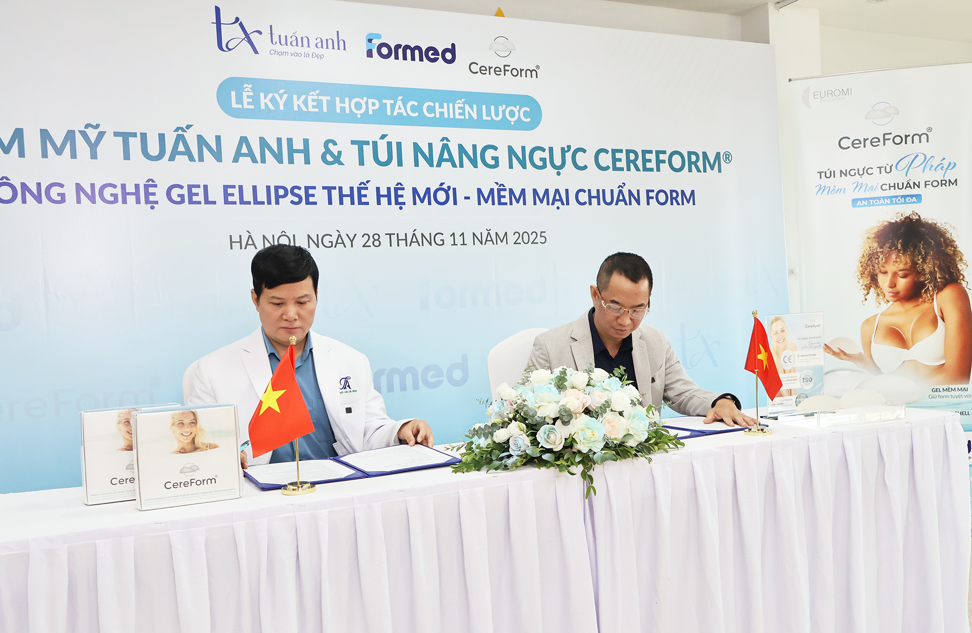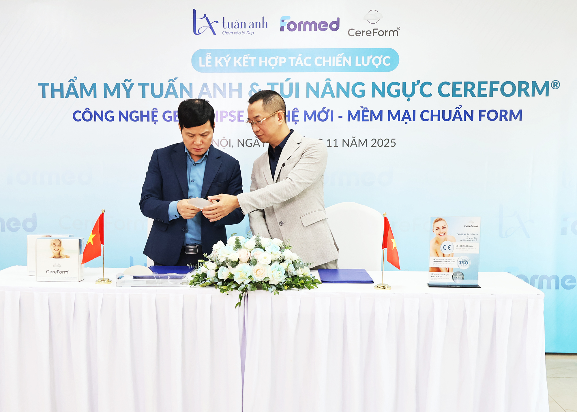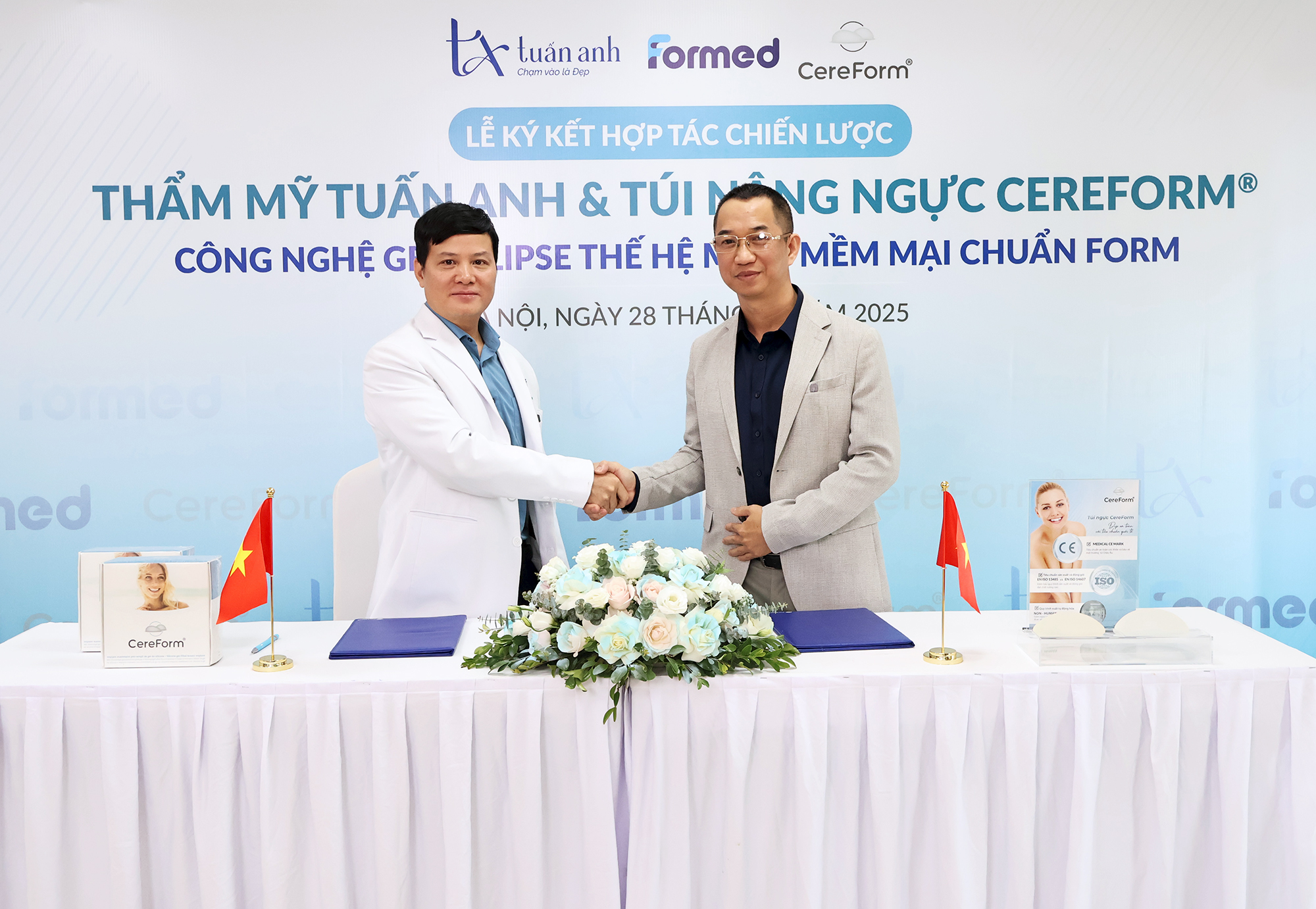 Sáng ngày 28/11/2025, Thẩm mỹ Tuấn Anh và Công ty Thiết bị Y tế Formed đã chính thức ký kết hợp tác triển khai dòng túi nâng ngực CEREFORM® – sản phẩm được sản xuất tại Pháp với công thức gel thế hệ mới cùng thiết kế đáy lõm nổi bật, mang lại độ mềm mại và khả năng giữ form tối ưu.